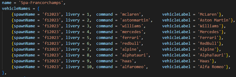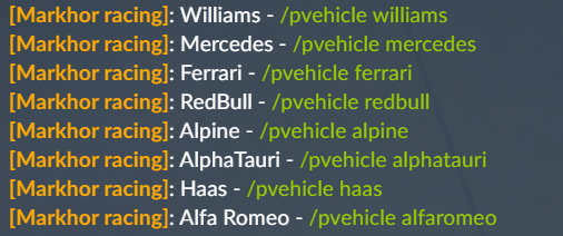 A livery can be set per vehicle (the vehicle color is always random). This makes it possible to make team cars, exactly the same vehicles but with their own livery. With this you make Formula 1 even more realistic than ever in FiveM!