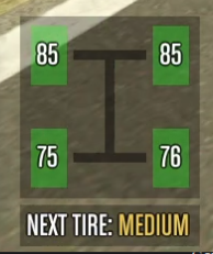 But, how do the pit stops work? During the race the driver can see the status of all tires, this player can also choose other tires with the arrow up button. As soon as the player reaches the pit entry the choice is locked and the maximum speed changes to a certain percentage which is set for that specific band on that specific map. As soon as the driver arrives at the pit exit, the tires have been repaired and the vehicle can be used again.